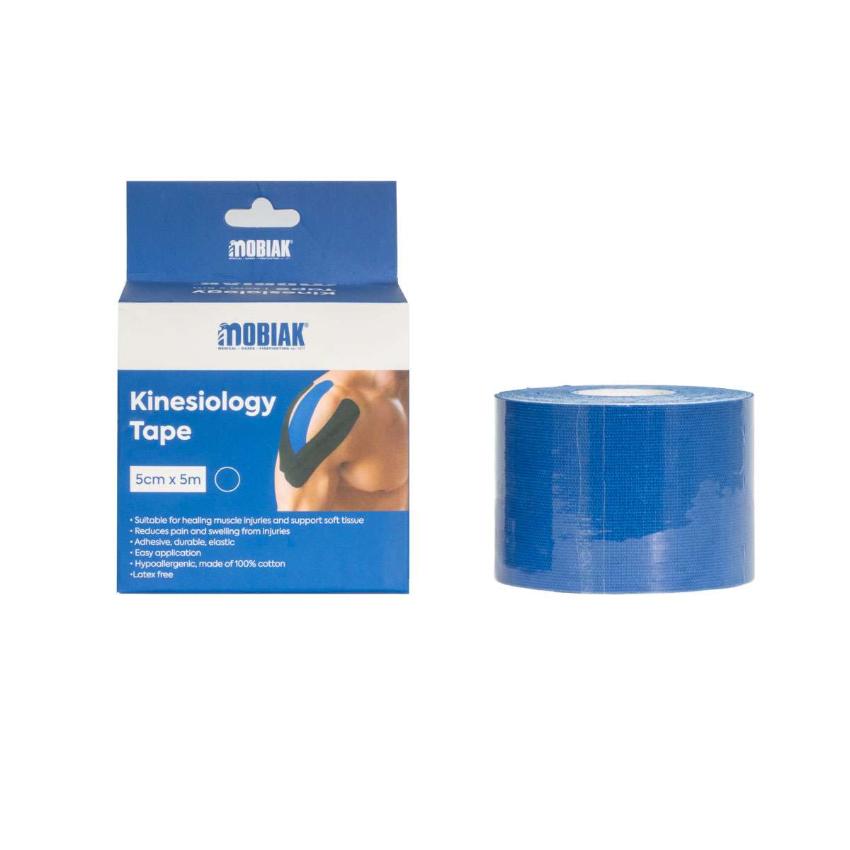 Кинезолошка лента – Плава хипоалергена, изработена од 100% памук, не содржи латекс, издржлива и еластична. Наменета за поттикнување на функционалното движење на телото во рана фаза, за време или по повреда. Ги штити зглобовите, мускулите, фасцијата и ги ублажува болките за време на вежбање. Го намалува влијанието врз зглобовите и тетивите, ја поттикнува циркулацијата на крвта и го олеснува мускулниот напон. Помага во корекција на деформитети, контрактура на тетиви, акутна или хронична повреда на тетиви, терапија за закрепнување на мускулите. Се користи за забрзување на заздравувањето на повредите на мускулите и нивна поддршка во исто време. Стратешки се нанесува на телото за да обезбеди поддршка, да ја намали болката и отокот од повреди. Има широк спектар на примена во областа на спортската медицина и физиотерапијата.