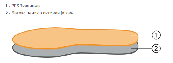 Анатомска влошка со специјален ефект кој ја пренасочува влажноста во активиран јаглероден слој преку горната специјална високо апсорбирана обвивка. Обезбедува заштита од размножување на бактерии кои се одговорни за развој на непријатен мирис на стапалата.