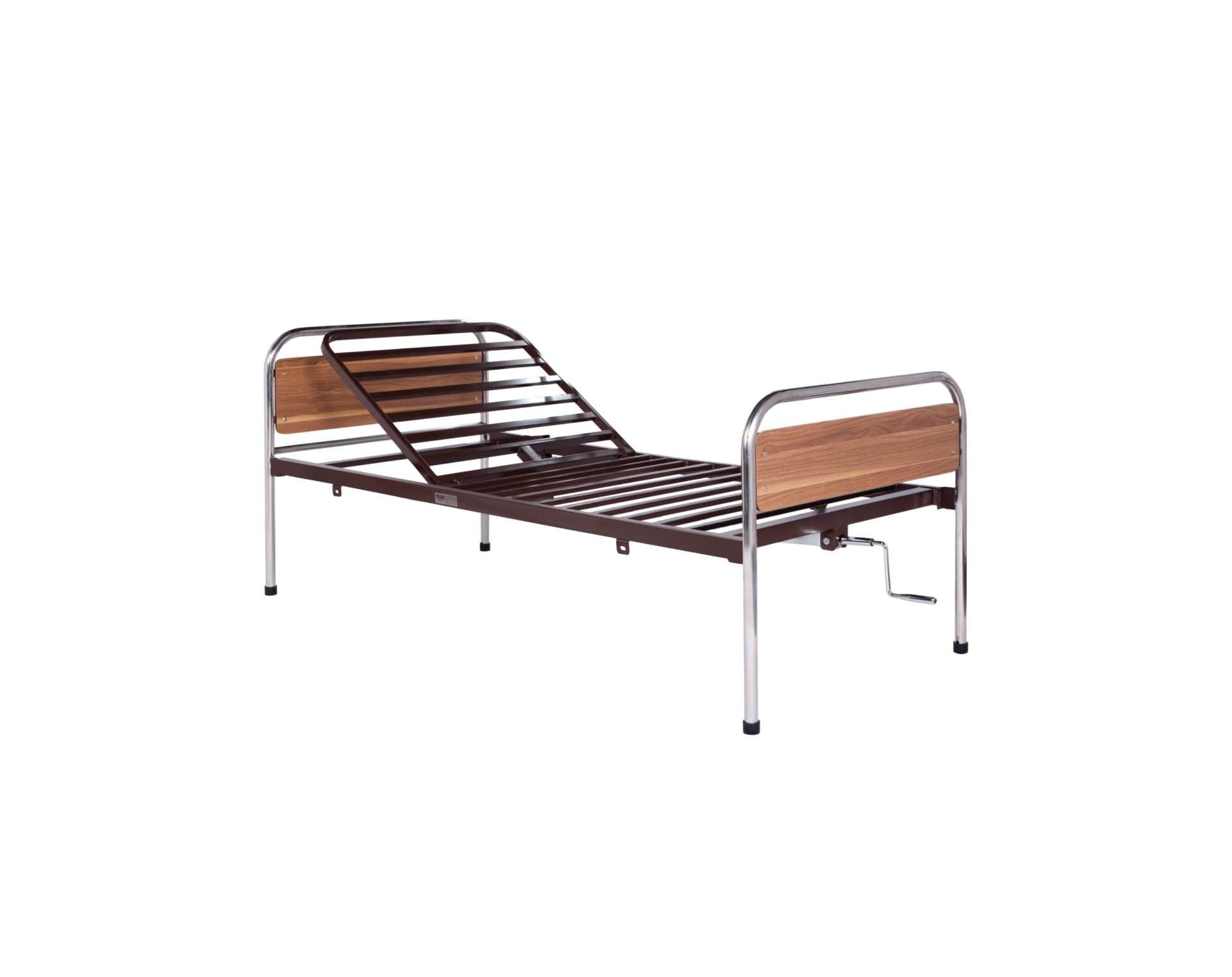 Болнички кревет со една опција (механички) изработен од челична рамка, дрвена плоча и метална рачка на коленестото вратило. Прецизно дизајниран да обезбеди исклучителна удобност и функционалност. Овој ортопедски кревет се одликува со единстена карактеристика - промена на наклонот во еден дел, што овозможува прилагодување на висината на грбот според потребите на пациентот. Обезбедува оптимална удобност, што го прави идеален избор за болници, клиники и здравствени установи.