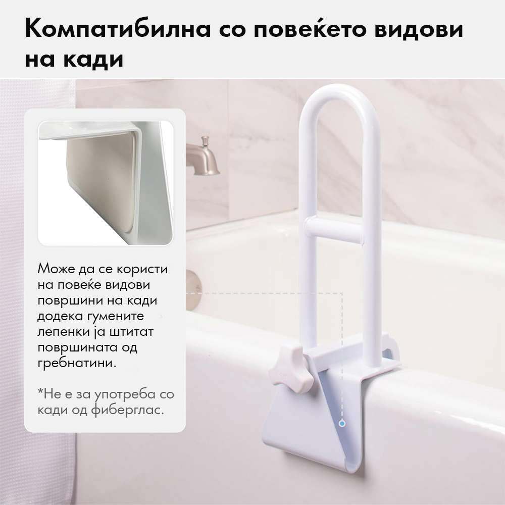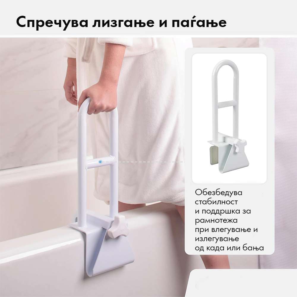 - Се користи за придржување, со цел поголема безбедност во бањата при капење и како помош при станување и седнување
