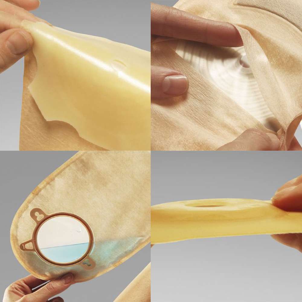 Шифра | 85200 Кесите за дводелен систем за уростома се пријателски за кожата, високо флексибилни заштитници направен од 100% хидроколоид кои обезбедуваат сигурно вклопување, штитејќи ја кожата и ефикасно абсорбирајќи ја влагата. Многу меката, соодветна и водоотпорна текстура на кесата создава удобност за кожата и го спречува потењето. Многу брзо се суши по пливање или туширање. Мекиот мембрански слој има одличен кислороден пуфер и целосно го спречува преносот на мирис. Кесите може лесно да се закачат на основната плоча. Пловечкиот прстен обезбедува многу силна и флексибилна врска помеѓу кесата и основната плоча. Поради присуството на еднонасочен вентил и спречување на враќање на урината во стомата, ризикот од истекување за време на спиењето е минимизиран.